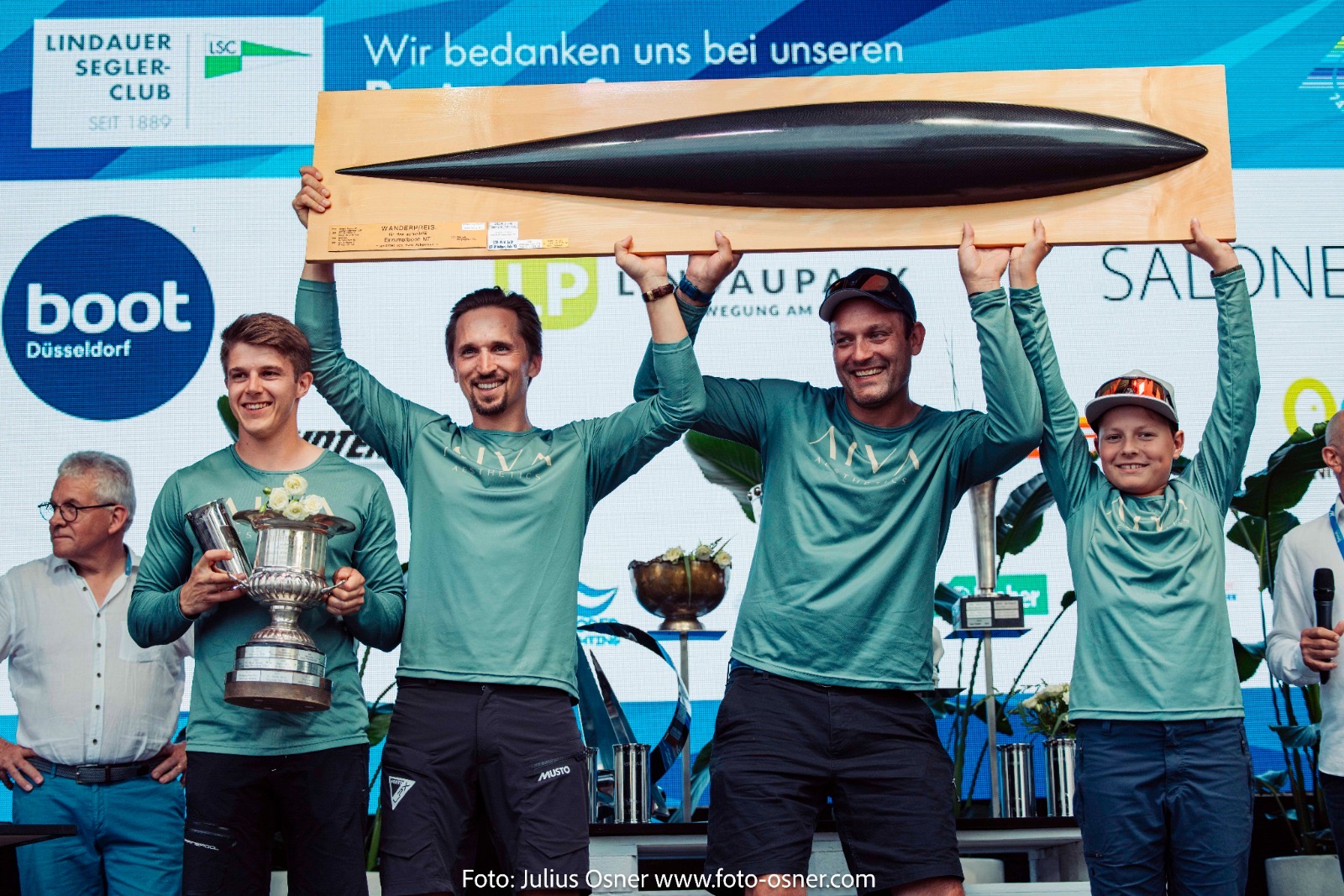 Dreifacher Triumph am Saisonende Bei der Siegerehrung folgte dann die Krönung einer außergewöhnlichen Saison: Das Team gewann nicht nur die Gesamtwertung der Doublehand-Klasse, sondern auch die Gesamtwertung in ORC1. Doch es kam noch besser – Dietmar Lenz, Präsident der Regattavereinigung Bodensee, hatte noch eine besondere Überraschung: Er überreichte den Wanderpokal „Internationaler Bodenseemeister aller ORC-Klassen“. Ein Moment, der bei Freunden, Familie und der gesamten Crew große Emotionen auslöste.